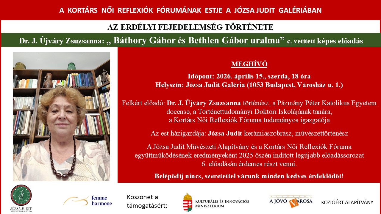 Dr. J. Újváry Zsuzsanna egyetemi docens (PPKE BTK), és a Kortárs Női Reflexiók Fóruma tudományos igazgatója 2025–2026-ban az Erdélyi Fejedelemség politikai, gazdasági és társadalomtörténetét mutatja be havi egy előadás keretében.