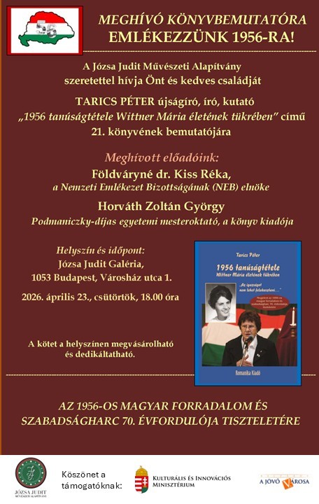 2026. április 23-án, csütörtökön 18 órakor „Emlékezzünk és emlékeztessünk 1956-ra” címmel kerül sor az 1956-os magyar forradalom és szabadságharc 70. évfordulója tiszteletére megjelent, Tarics Péter újságíró, író, kutató „1956 TANÚSÁGTÉTELE WITTNER MÁRIA ÉLETÉNEK TÜKRÉBEN” című legújabb, a 21. könyvének ünnepélyes bemutatójára a Józsa Judit Galériában.