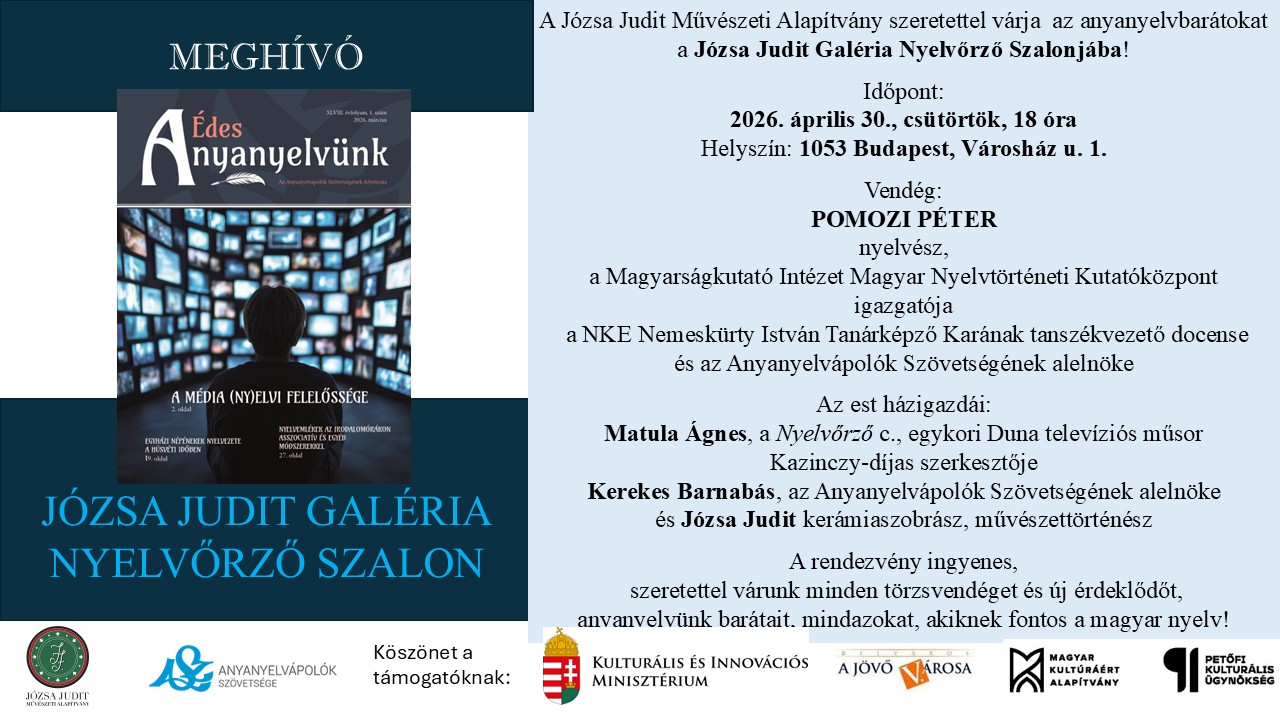 A rendezvény az Anyanyelvápolók Szövetsége és a Józsa Judit Művészeti Alapítvány szervezésében valósul meg. A házigazdák: Matula Ágnes, a Nyelvőrző c. egykori Duna Televíziós műsor Kazinczy-díjas szerkesztője, Kerekes Barnabás, az Anyanyelvápolók Szövetségének alelnöke, és Józsa Judit kerámiaszobrász, művészettörténész. Az ingyenes estre szeretettel várnak minden törzsvendéget és új érdeklődőt, anyanyelvünk barátait, mindazokat, akiknek fontos a magyar nyelv! [ M e g h í v ó ]