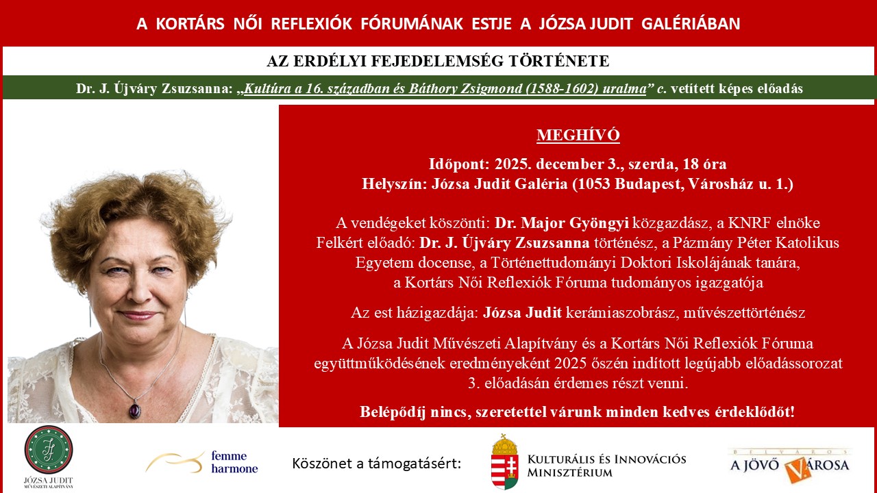 2025. december 3-án, kedden 18 órai kezdettel dr. J. Újváry Zsuzsanna: Az Erdélyi Fejedelemség története c. sorozatának 4. vetítettképes előadására „Kultúra a 16. században és Báthory Zsigmond (1588-1602) uralma” címmel kerül sor a Józsa Judit Galériában.