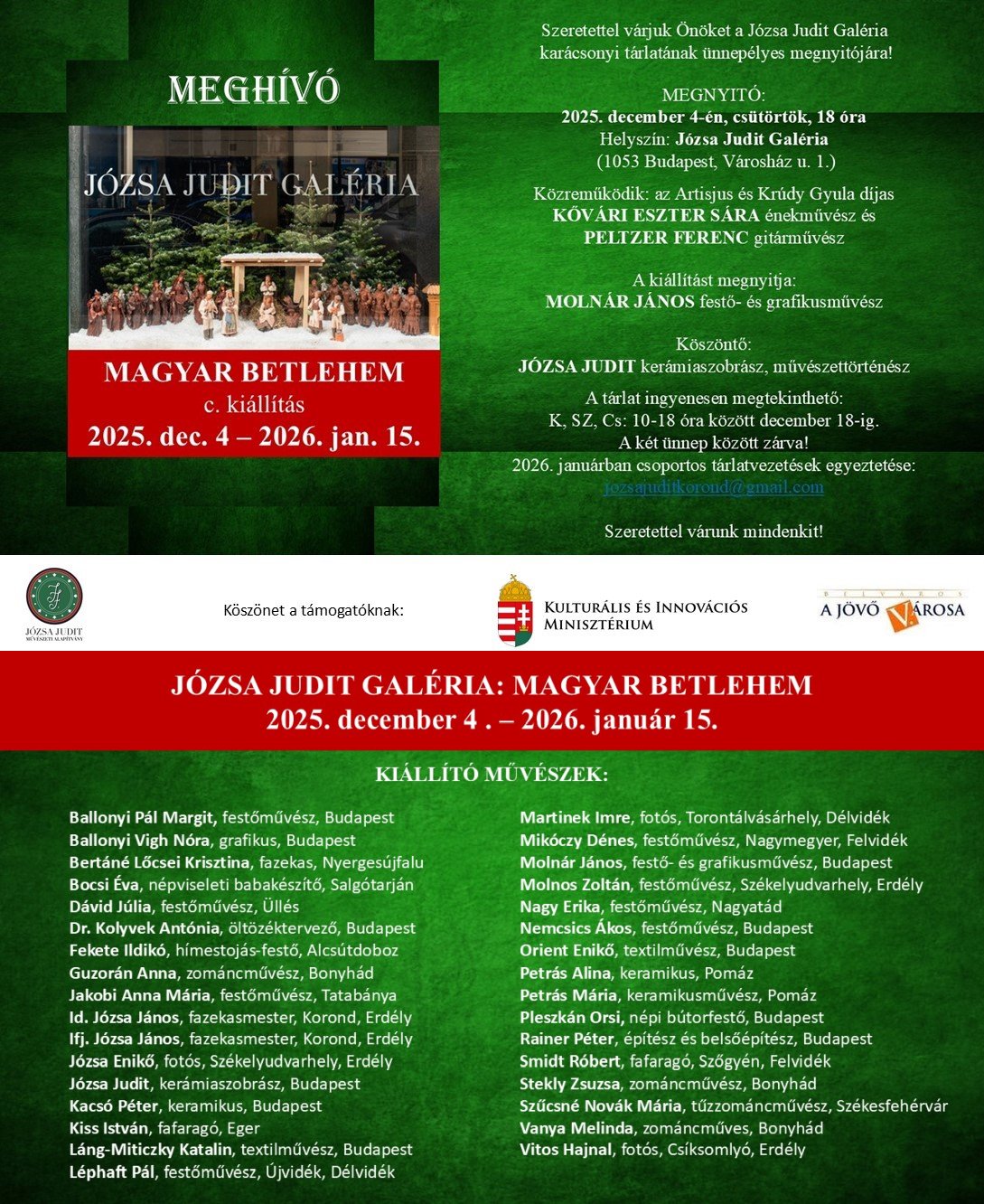 2025. december 4-én, csütörtökön 18 órára szeretettel várjuk Önöket „Magyar Betlehem” címmel a Józsa Judit Galéria téli tárlatának ünnepélyes megnyitójára.